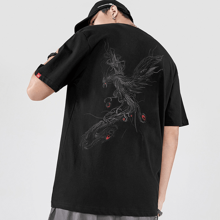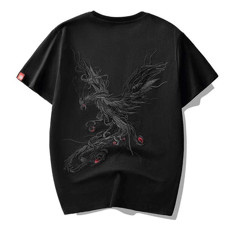 ASIS 중국 스타일 남성 피닉스 자수 반팔 티셔츠 블랙 XL