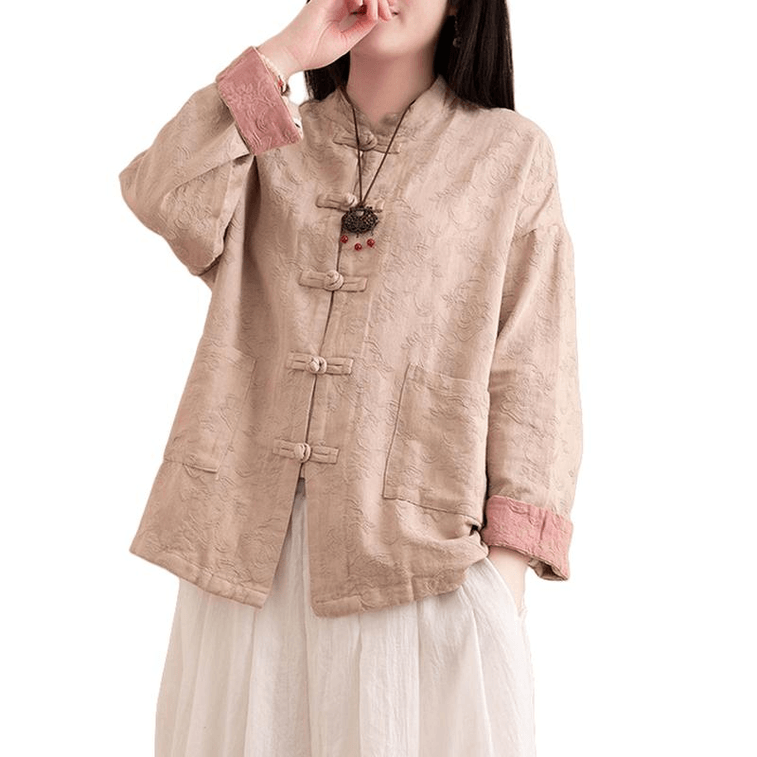 중국 ASIS 새로운 중국 스타일 면 및 리넨 디스크 버튼 자카드 셔츠 재킷 - 카키 M
