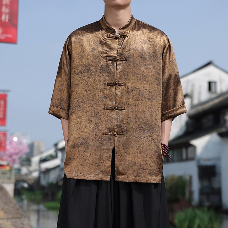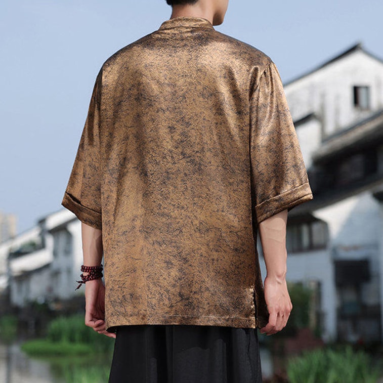 ASIS 남성용 새로운 중국 스타일 아이스 실크 프린트 단추 탕 슈트 셔츠 - 골드 5XL