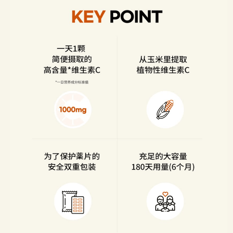 제조 과정에서 "추출-전환-발효-정제"를 통해 안정적인 비타민 C 조성물을 형성하여 일일 권장 섭취량을 충족합니다. 비타민 C는 환경에 민감하기 때문에, 개별 PTP 포장과 외부 알루미늄 백 밀봉의 이중 설계를 적용하여 공기, 습기, 빛의 영향을 최소화하고 제품 안정성을 더욱 향상시켰습니다.