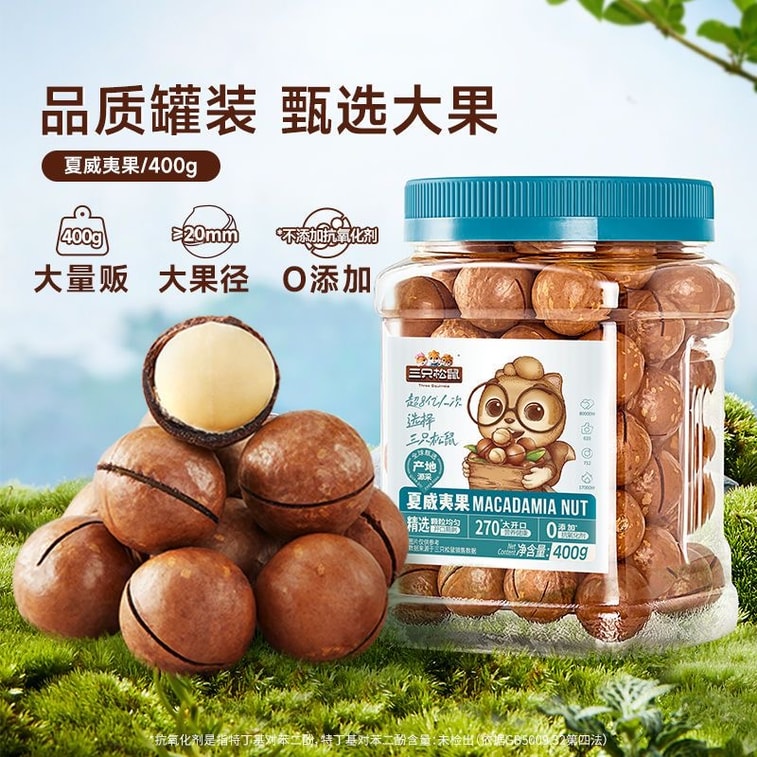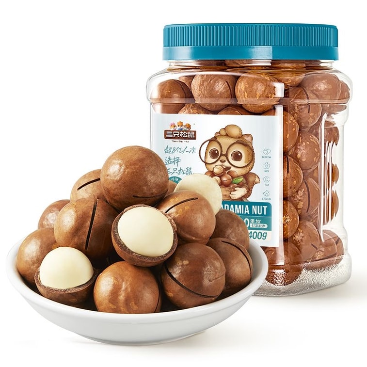 [중국 직배송] 쓰리 스쿼럴스 통조림 마카다미아넛 400g, 특대형(지름 22-24mm), 새해맞이 구운 견과류, 크리미한 맛, 건강 간식, 건과일