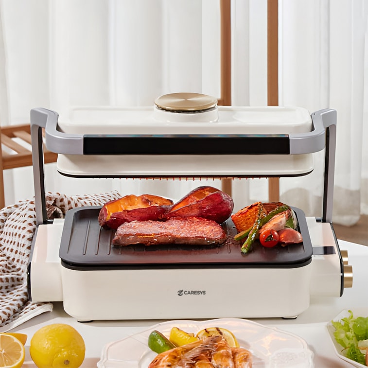 케어시스 한국식 무연 바비큐 그릴, 화이트, 1피스 세트 - 이중 가열, 빠른 조리, 한국식 바비큐 전기 그릴 - 2~3인용