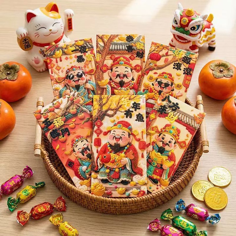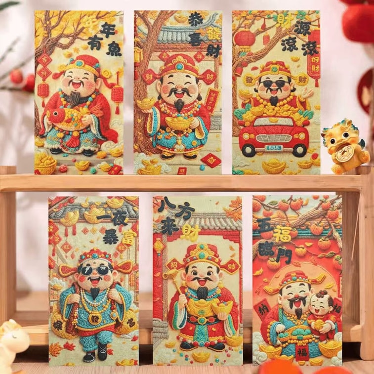 Embroidery Style God Of Wealth Red Envelope 6 Pcs