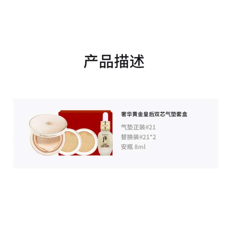 [홍콩 직배송] 더 히스토리 오브 후 골드 쿠션 파운데이션 #21 (한국) - 정품 + 리필 2개 + 8ml 골드 앰플. 고급스러운 메이크업과 스킨케어, 윤기 있고 탄력 있는 피부, 안티에이징 및 주름 개선 효과.