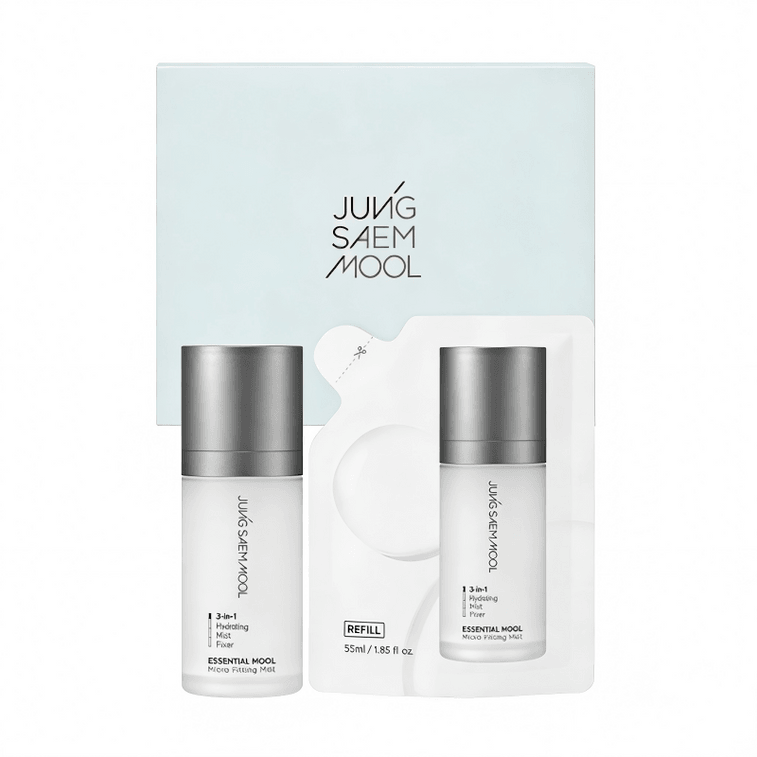 정샘물 정샘물 에센스 마이크로 어드레싱 메이크업 세팅 스프레이 세트 (3-in-1) - 수분 공급, 보습, 유분 조절, 메이크업 밀착력 강화, 지속력 향상 (정품 55ml + 리필 55ml) | Yami