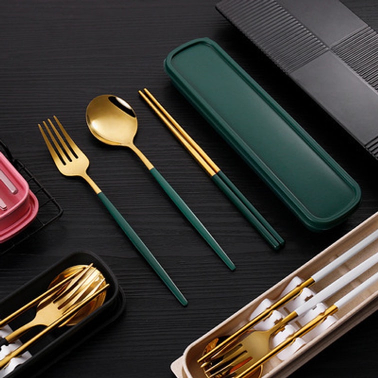 [중국 직송] 칭타이타이 스테인리스 스틸 칼 세트(젓가락, 숟가락, 칼 상자 포함) (녹색과 금색 숟가락과 젓가락 + 매칭 상자)