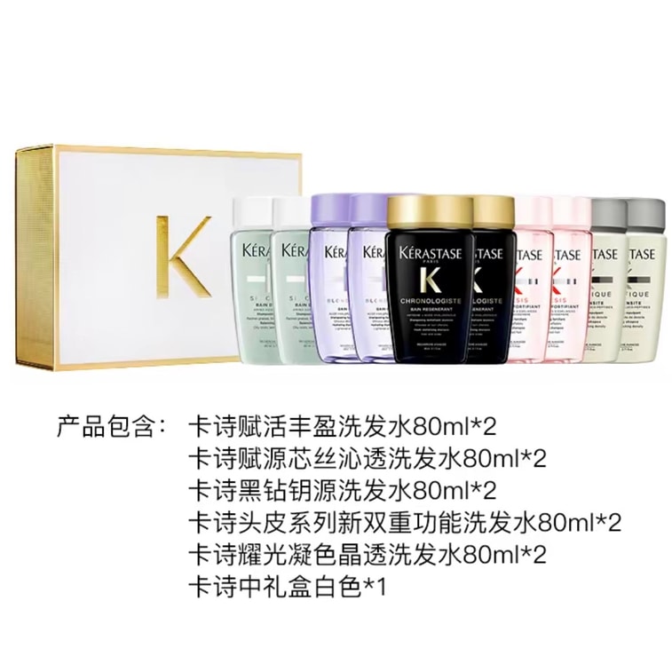 케라스타즈 5성급 시리즈에서 엄선하여 2팩씩 총 10팩(80ml)의 프로페셔널 샴푸를 담았습니다.