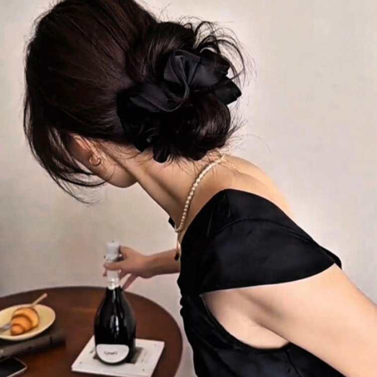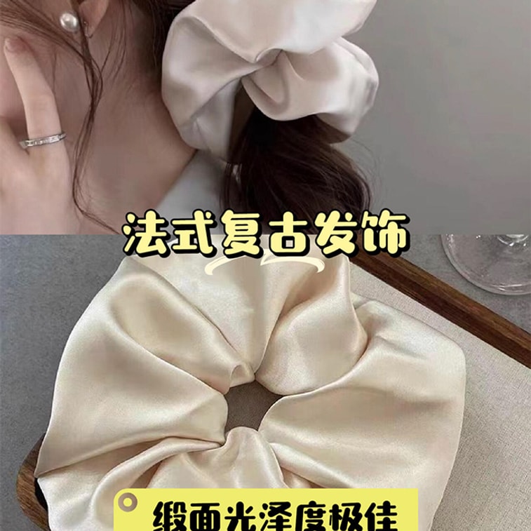 최고급 프랑스 레트로 새틴 헤어 타이, 윤기 있는 새틴 스크런치, 굵은 사이즈, 뛰어난 탄력성 [2개입] 라이트 샴페인 + 블랙, 효과적인 헤어 타이, 얼굴을 더 작아 보이게 해 줍니다