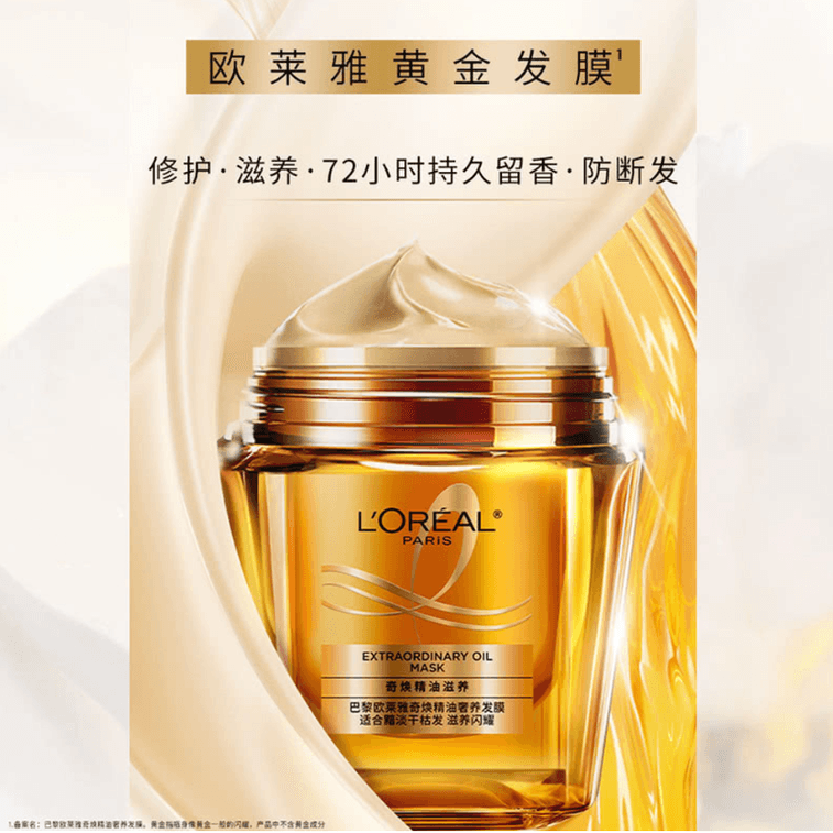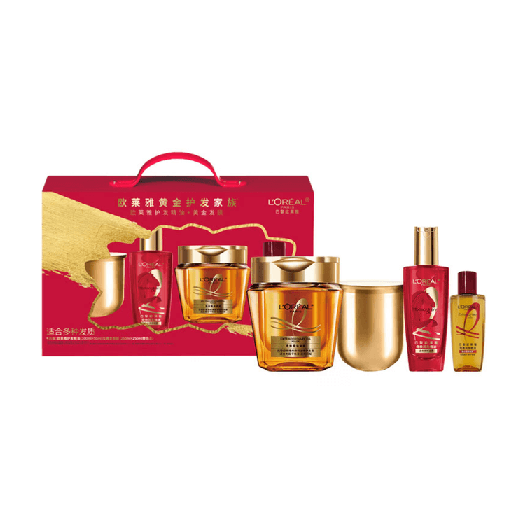 [홍콩 직배송] 로레알 파리 미니 골드 보틀 헤어 오일 100ml + 50ml 여행용 사이즈 + 골드 헤어 마스크 250ml + 250ml 리필 | 72시간 딥 리페어, 곱슬거림 완화, 파마 및 염색 모발 보호 | 1개 구매 시 4개 증정 선물 세트 | Yami