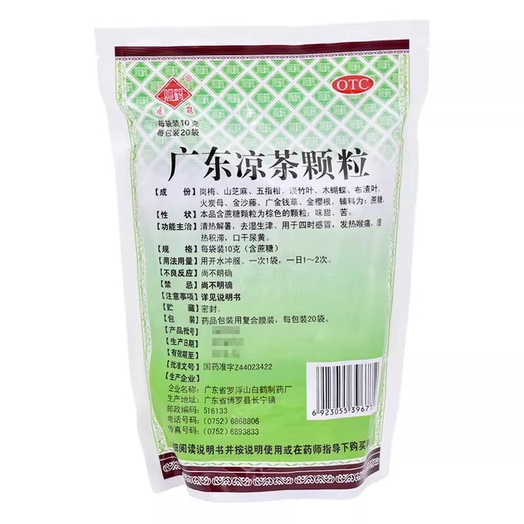 [중국 직송] 관허 광동 허브차 과립은 열을 내리고, 여름철 더위를 완화하며, 습기를 제거하고, 체액을 배출하며, 감기, 발열, 인후통, 습열 정체, 구강 건조증, 황변을 치료합니다(10g x 20봉지)