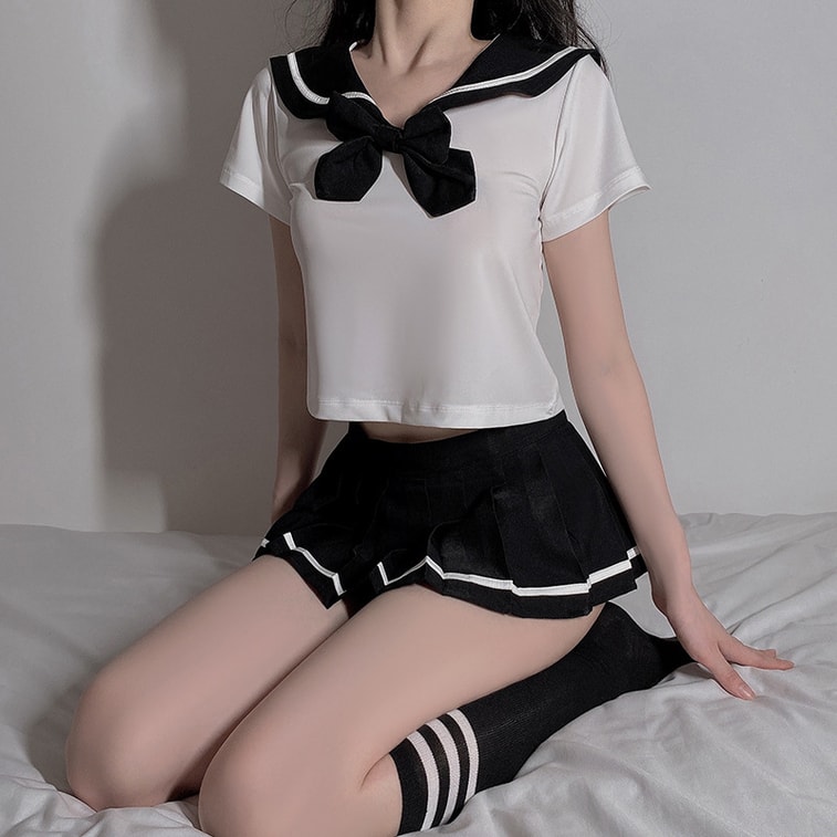 [중국 직배송] 구이루오 여성 섹시 란제리 세트, 일본 교복 스타일, 유혹적이고 섹시한 숏 스커트 세트, 블랙 세트 + 모델 스타일 학생 양말, 프리사이즈