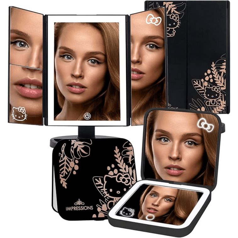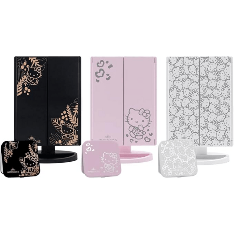 Impressions Vanity Hello Kitty Super Cute Trifold & Compact 세트로 더욱 사랑스러운 휴가를 만들어 보세요. 헬로 키티 삼단 LED 메이크업 거울과 귀여운 콤팩트 거울로 세세한 부분까지 놓치지 마세요. 삼단 거울의 세 개의 거울 패널은 원하는 메이크업 조명에 맞춰 쉽게 조절 가능하며, 어떤 각도나 위치에서도 메이크업을 완벽하게 커버할 수 있도록 특별히 디자인되었습니다. 핑크, 화이트, 블랙 색상으로 출시됩니다.