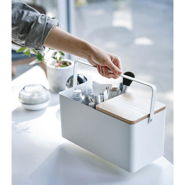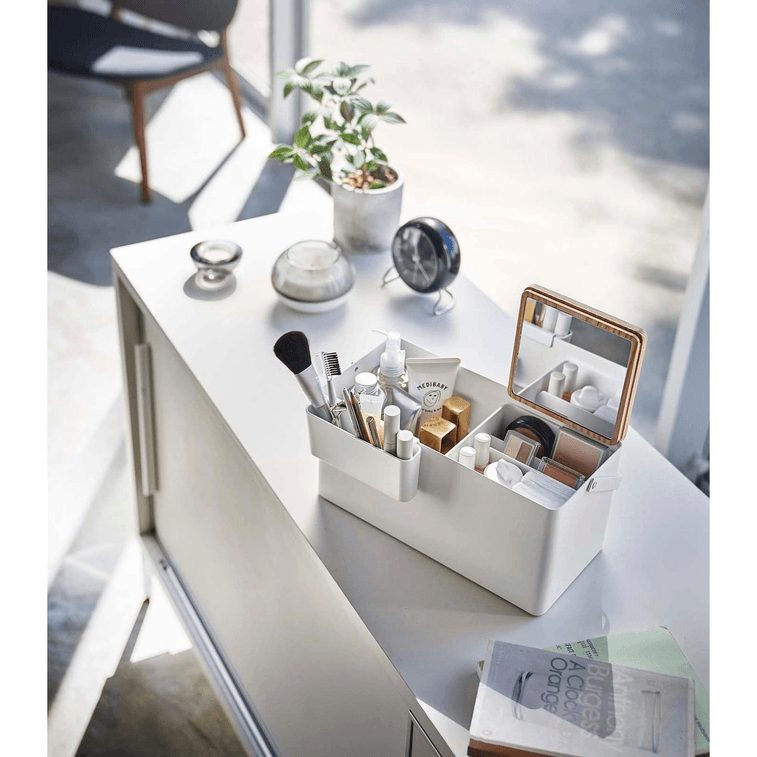 이 화장품 정리함을 보니 얼굴이 빨개지네요. 케이스에 달린 거울을 보면 누가 더 예뻐 보이는지 감탄하게 돼요. 손잡이가 있어 집안 어디든 쉽게 가지고 다닐 수 있고, 언제든 거울로 립스틱을 정교하게 바를 수 있죠. 칸막이와 슬라이딩 트레이는 모든 크기의 화장품 병, 튜브, 브러시를 깔끔하게 보관하기에 완벽합니다.