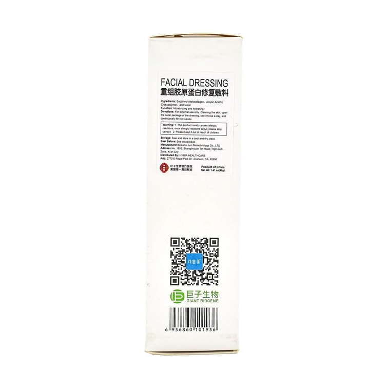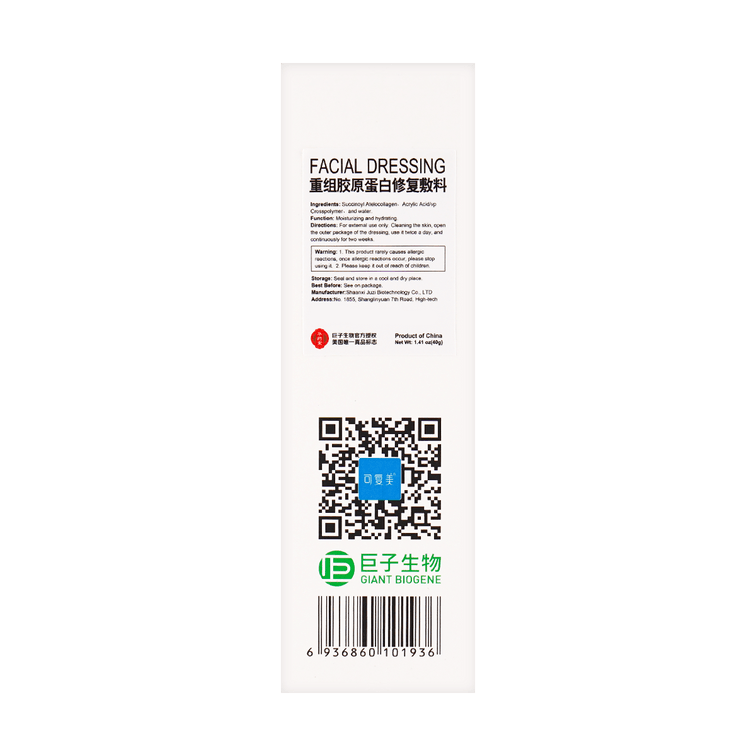 본 제품은 재조합 인간화 1형 콜라겐과 아크릴산(에스테르) 아크릴아마이드 공중합체 및 기타 보조 재료로 구성된 드레싱입니다.