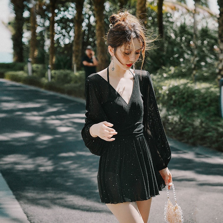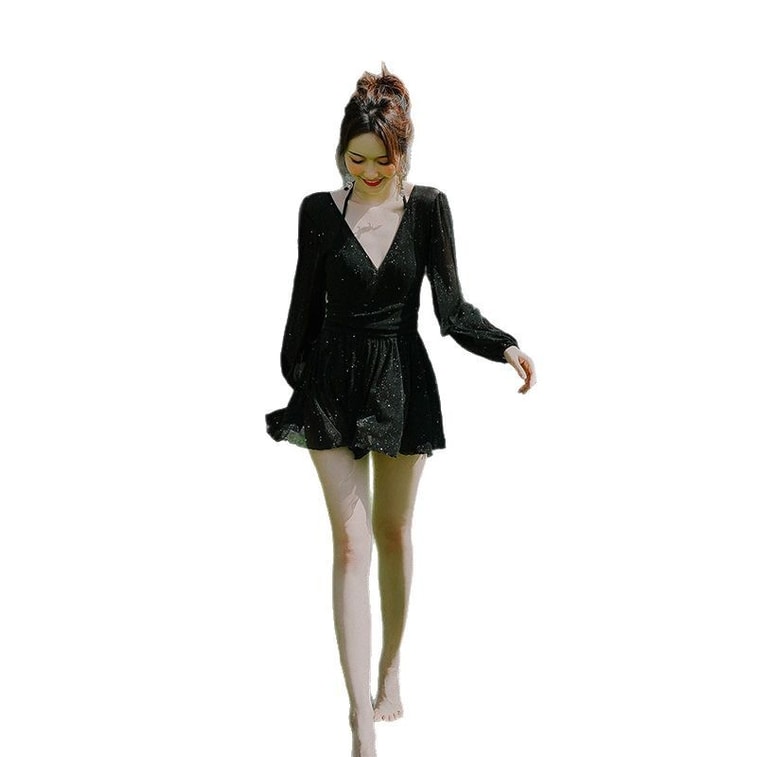 이메이산 긴팔 슬림핏 보수형 노출 방지 원피스 수영복, 블랙, 사이즈 M