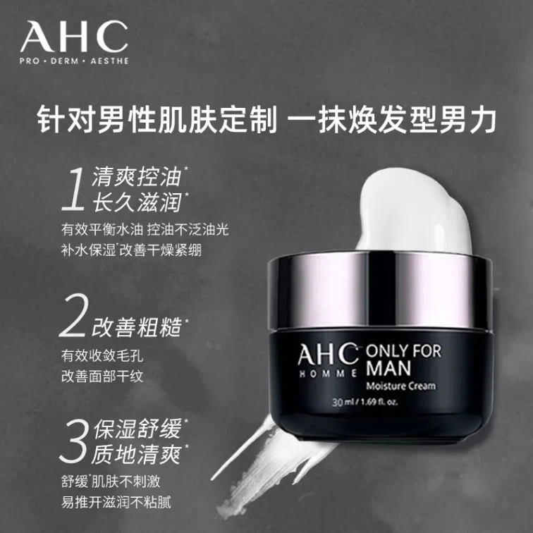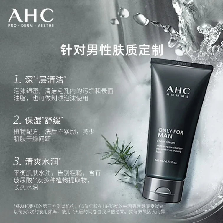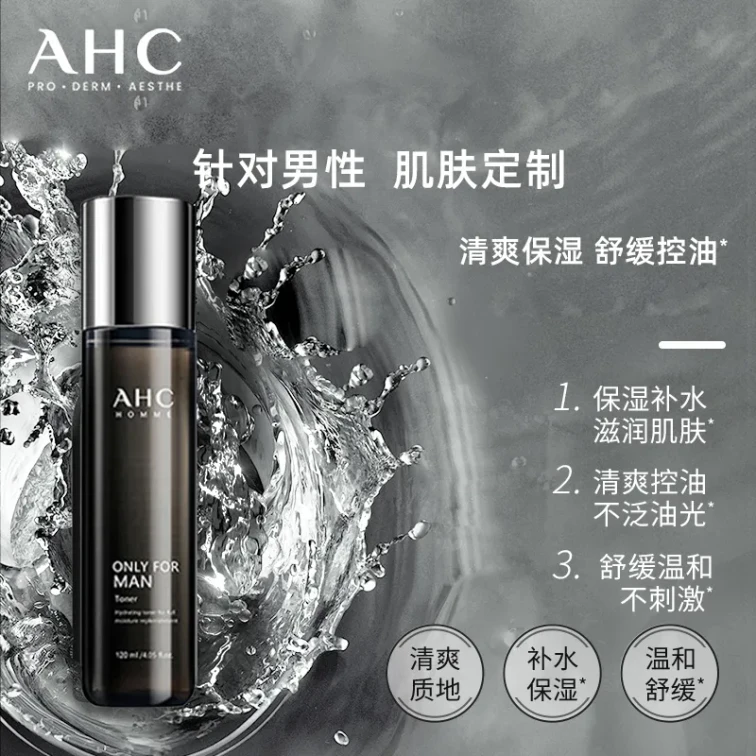 AHC 남성용 워터, 로션, 클렌저 세트 (중국 직송) - 보습, 진정, 상쾌함, 수분 공급, 딥 클렌징, 유분 조절. 구성: 워터 120ml, 로션 120ml, 클렌저 140ml, 크림 30ml.
