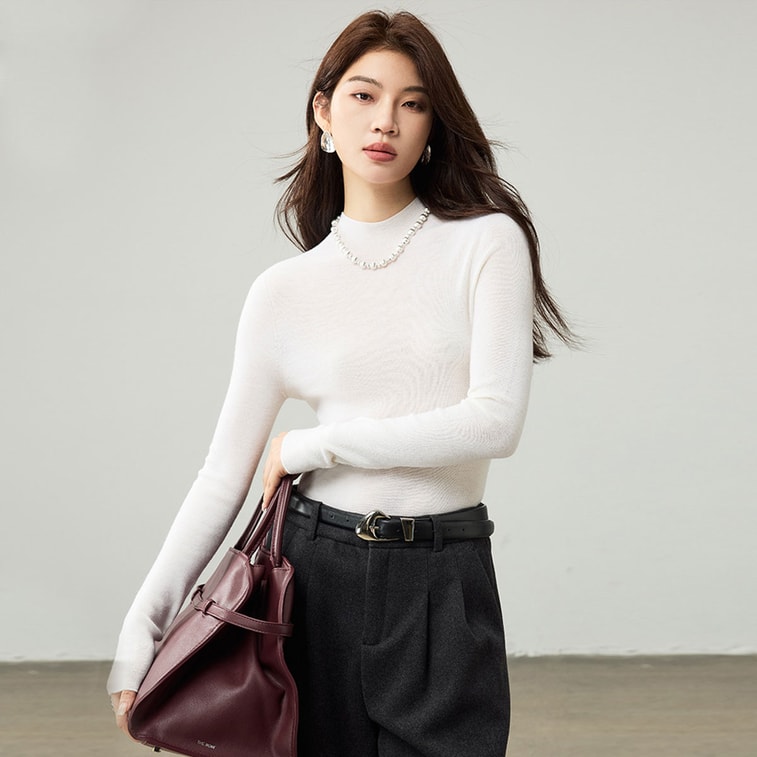 [중국 직배송] HSPM 심플하고 스타일리시한 양쯔강 원사 하이넥 울 스웨터, 18바늘 무봉제 베이스 레이어, 화이트, 사이즈 M
