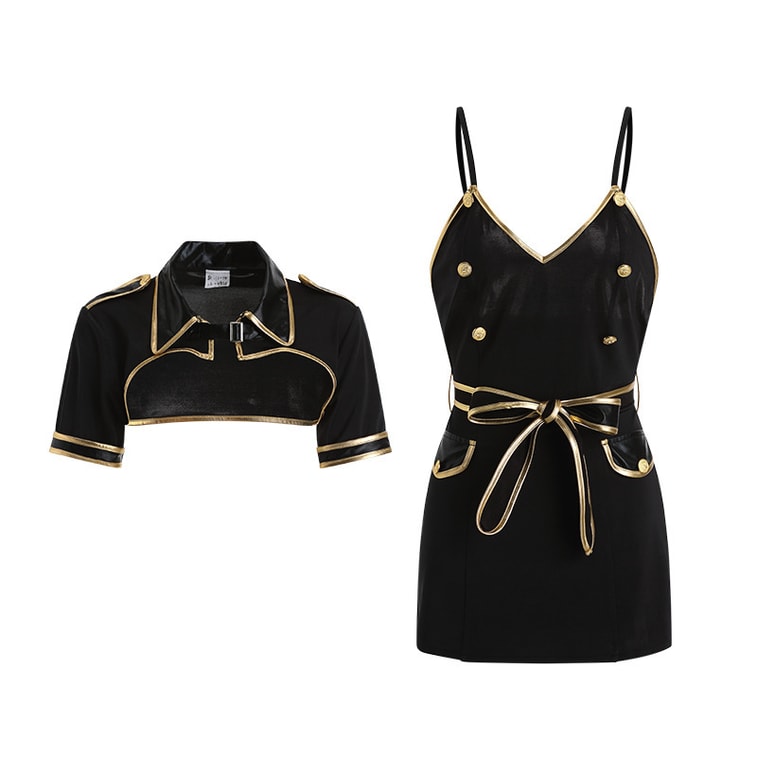 앞면 깊은 브이넥 디자인과 대비되는 골드 장식이 가슴의 곡선을 더욱 강조해줍니다.