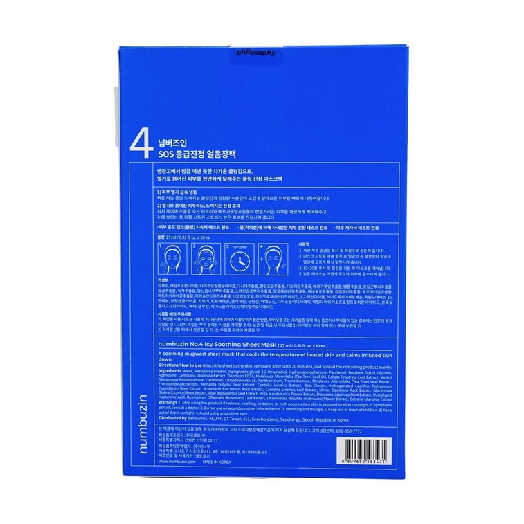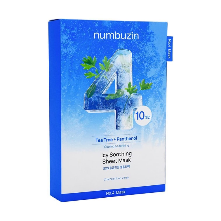 넘버4 아이시 수딩 시트 마스크, 4매 - 붓기 완화, 열감 및 붉은기 진정, 햇볕에 탄 피부 회복