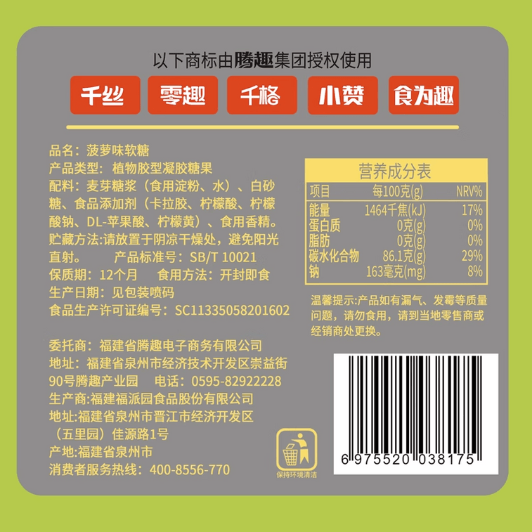 【중국 직송】첸시 파인애플맛 소프트 캔디 과일맛 캔디 200g*1봉지