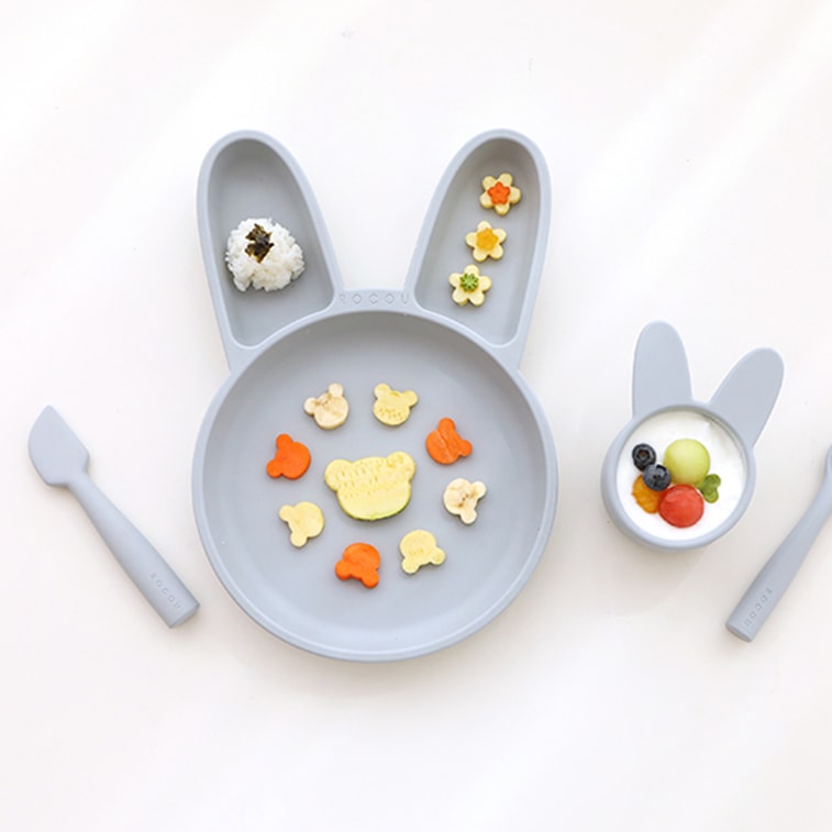로코유 아기 실리콘 접시 먹이기 접시, 토끼 바닐라 블루 12.0인치 x 7.9인치 x 1.3인치 | Yami