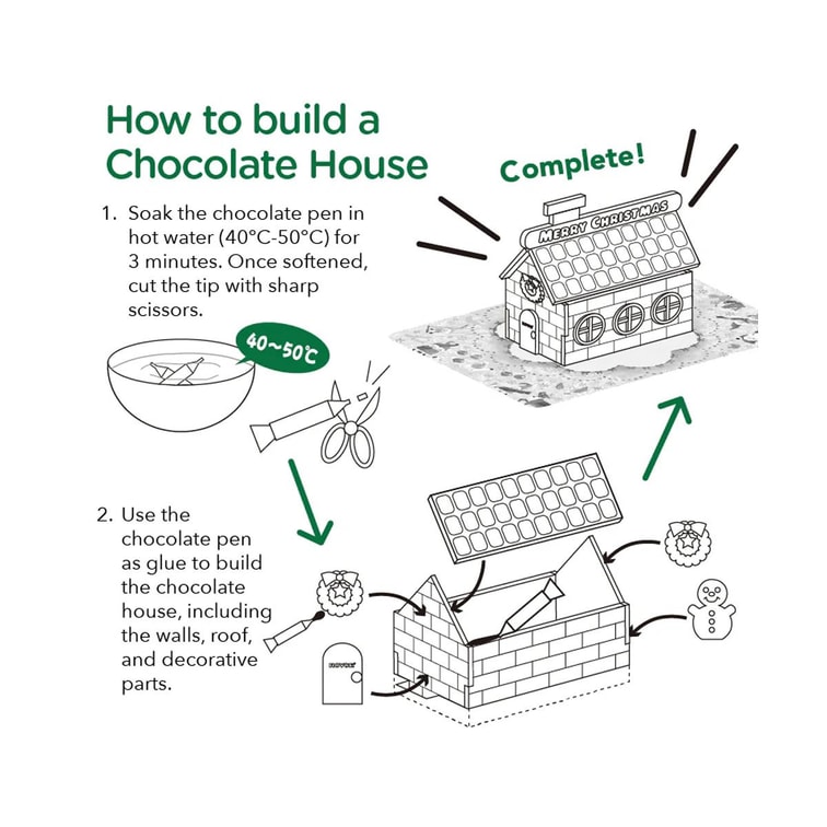 1. Each box comes with two chocolate pens to be used as adhesives, which can be melted in hot water for the assembly process.