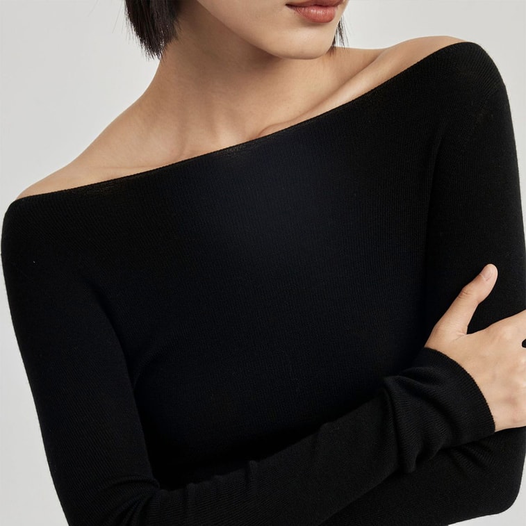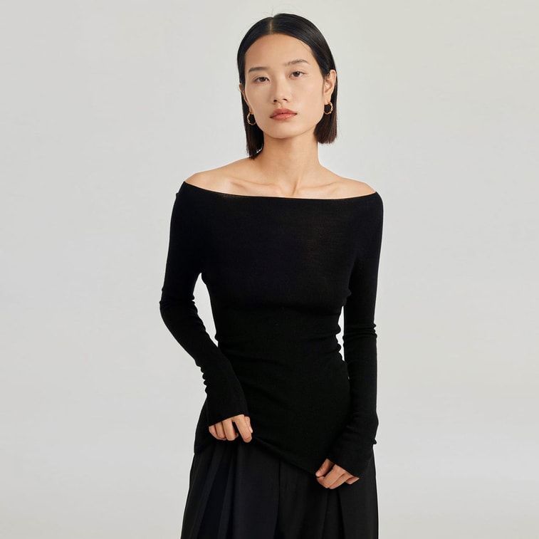 [중국 직배송] HSPM 심리스 오프숄더 울 스웨터, 슬림핏 베이스 레이어 긴팔 니트 탑, 블랙, 사이즈 S