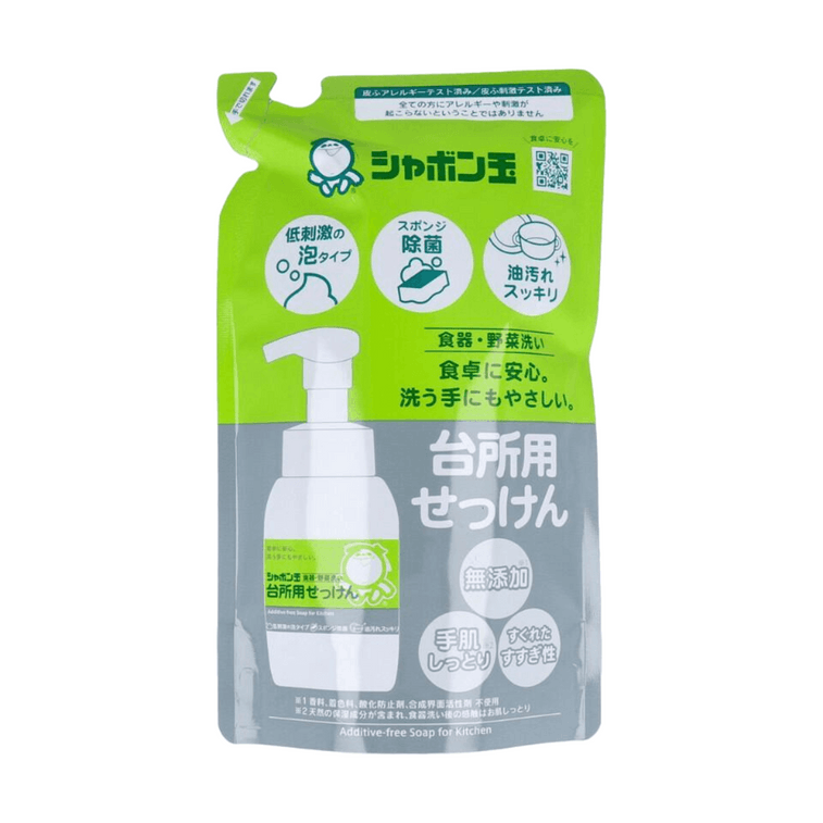 This is the first-ever foaming type kitchen soap. It features a new bottle design that resists clogging and dripping. Gentle on the skin, it effectively removes grease and odors. Excellent rinsing performance ensures the foam rinses off cleanly. Made using a traditional kettle-boiling maturation method, this additive-free soap contains no fragrance, coloring agents, or synthetic surfactants. It also disinfects sponges.