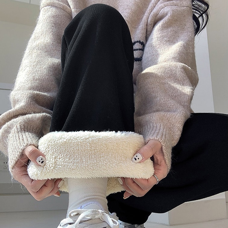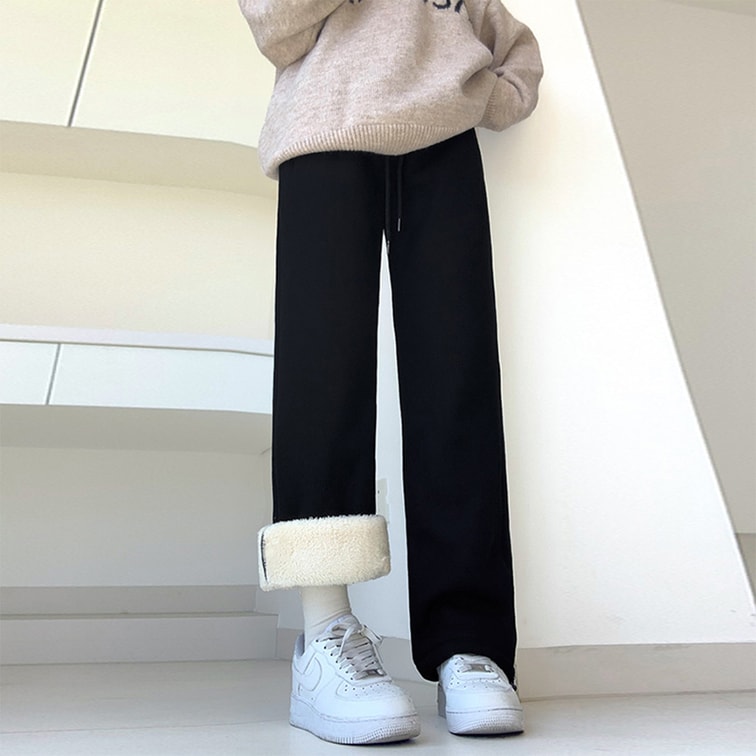 [중국 직배송] HSPM 램스울 스웨트 팬츠, 가을/겨울 루즈핏 조거 팬츠, 두꺼운 웜 캐주얼 와이드 레그 팬츠, 스트레이트 레그 플리스 안감 스웨트 팬츠, 블랙 램스울 엑스트라 롱 스타일, XXL, 1피스