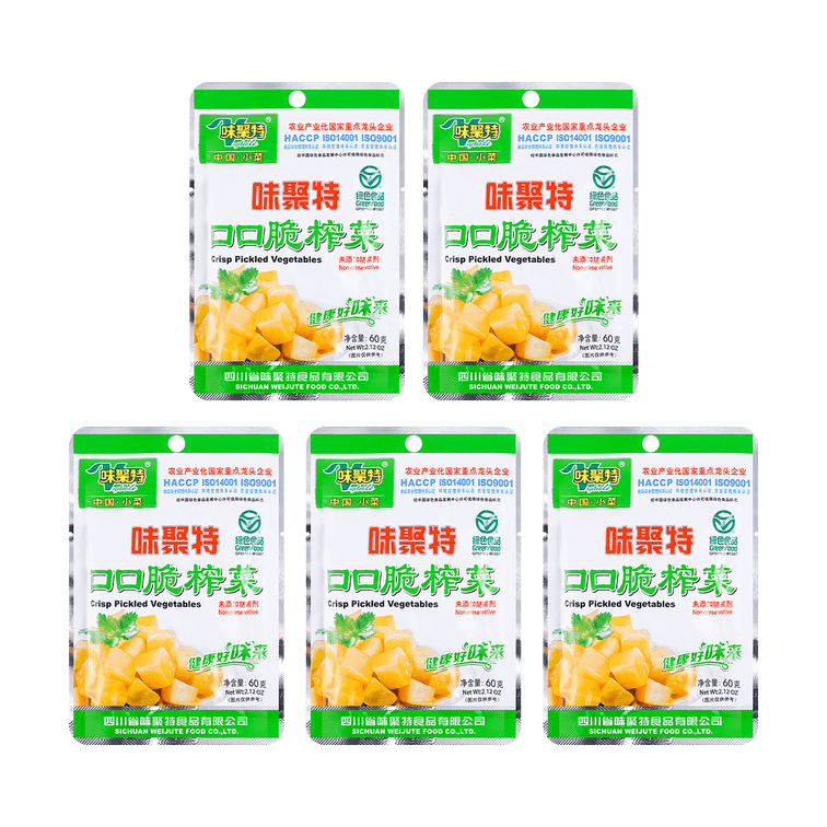 WEIJUTE Crisp Pickled Vegetable (ZhaCai) uses precisely selected fresh mustard plant stem as its main ingredient. Then it goes through detailed procedures and is seasoned with secret spices, making it irresistible! Crunchy and salty, it tastes great with rice or noodle!