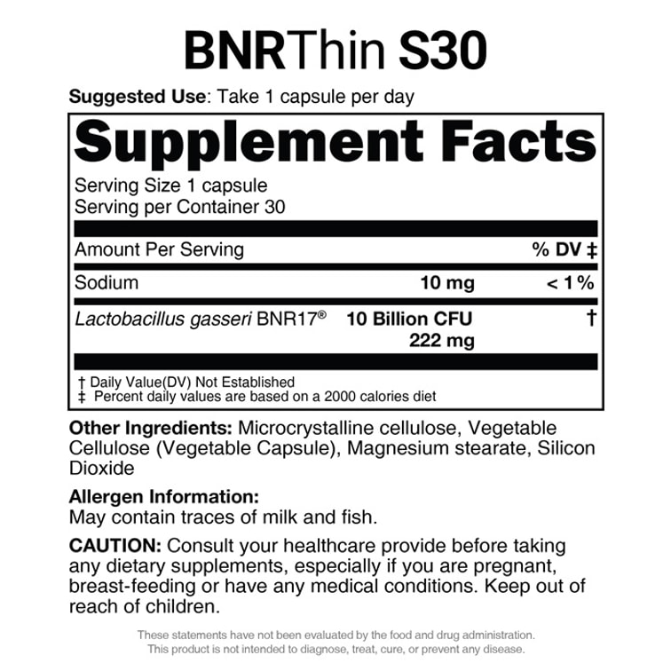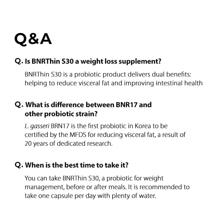 한국 BNRThin S30 체중관리 프로바이오틱스 락토바실러스 가세리 BNR17 100억 CFU 함량 보장 30정