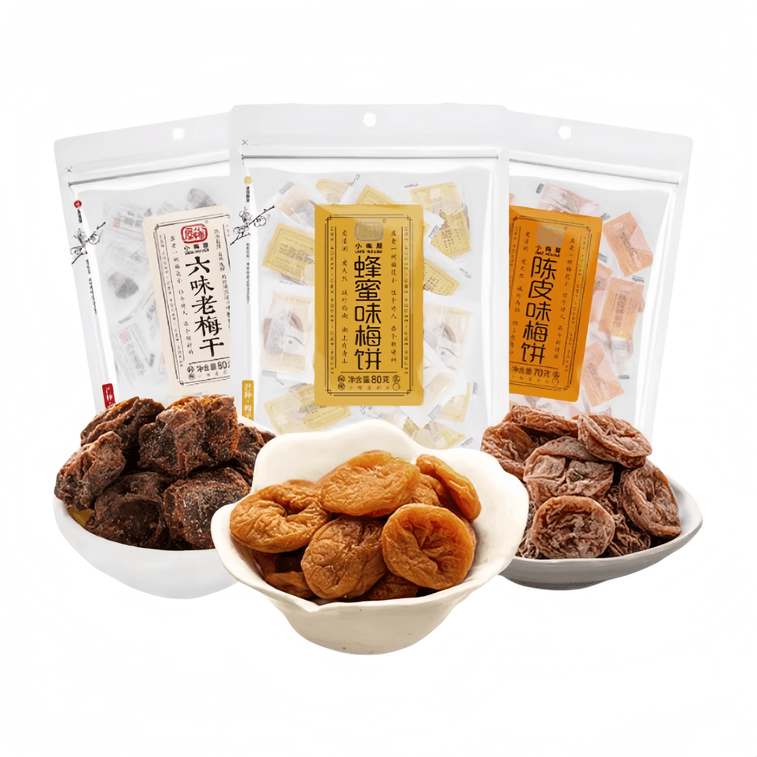 [중국 직배송] 샤오메이 하우스 매실 3가지 맛 세트 (총 3봉지): 꿀맛 매실 케이크 (1봉지), 귤껍질맛 매실 케이크 (1봉지), 6가지 맛 건매실 (1봉지) | Yami