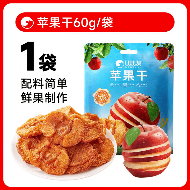BiBiZan 비비잔 옌타이 건사과 - 무설탕, 무첨가, 두툼하게 썬 오리지널 사과 펄프, 설탕에 절인 과일, 건과일 잼, 60g/봉지 | Yami
