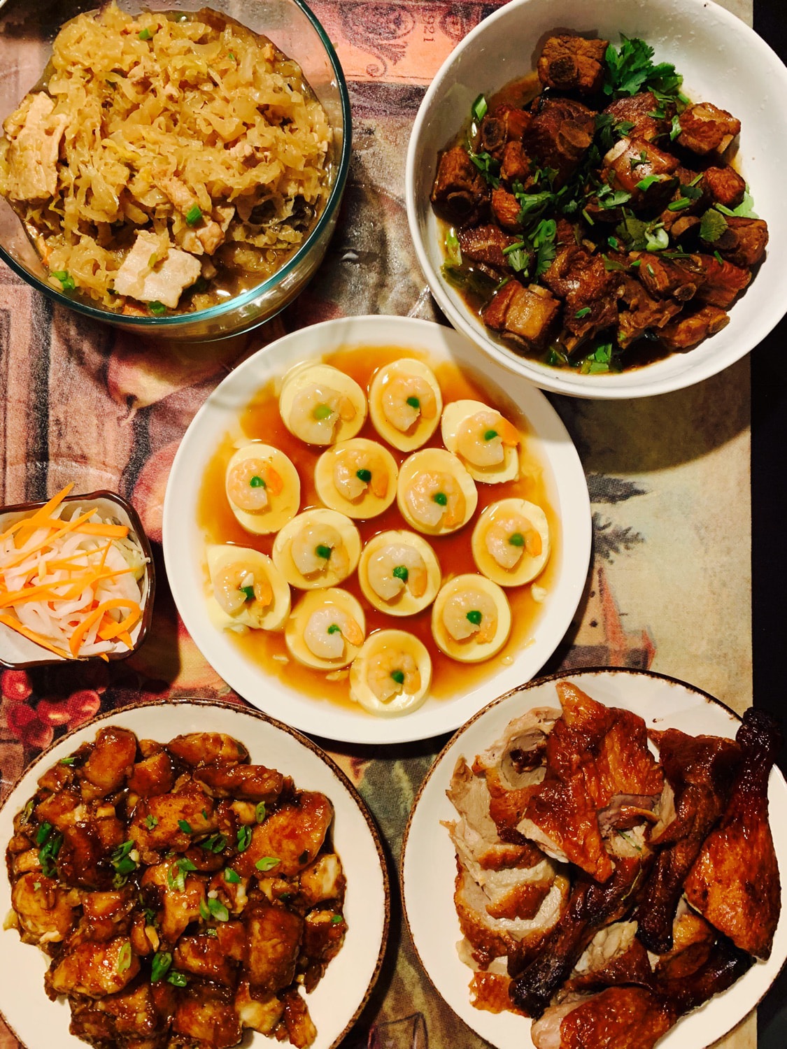 Including Braised Fish, Steamed Prawns with Tofu, Roast Duck, Braised Pork Ribs and White Pork with Pickled Cabbage. Happy to eat.