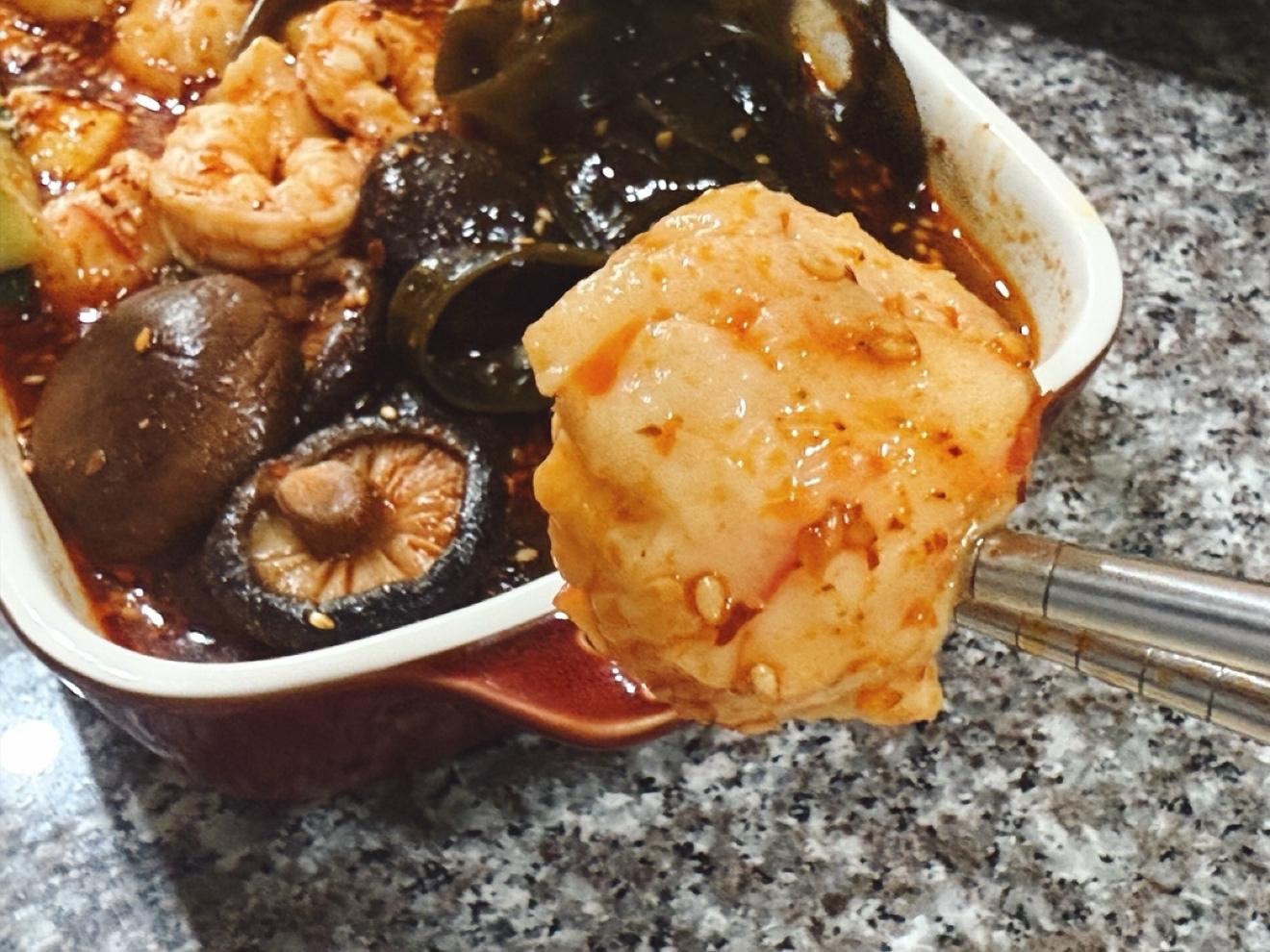 这个红油钵钵鸡炒鸡香~!只要把自己爱吃的丸子,蔬菜,煮熟加进去浸泡15分钟就能开吃了。煮牛肚,肥牛,还有丸子的时候加点料酒可以更好的去除腥味。我非常喜欢的配菜就是脆脆虾丸和蟹棒啦~配这个底料超级香,回味麻麻的,很足味!