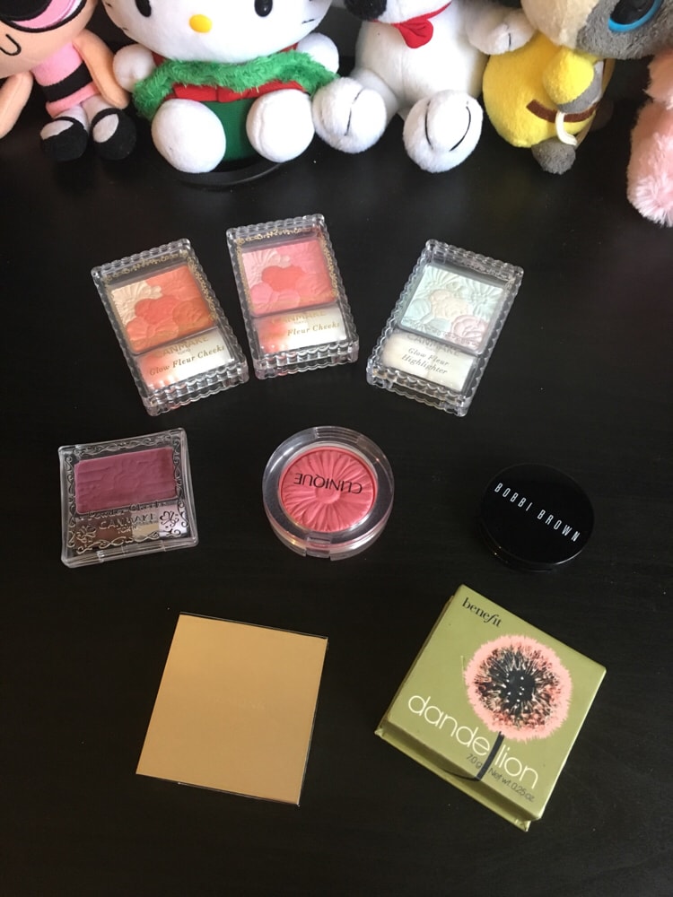 腮红在我看来是化妆程序中最后也是最重要的一笔。上一点点腮红,气色马上不一样。我现在用的就是这几种腮红。有 canmake , Bobbi brown, benefit, clarins. 其中 Bobbi brown 和clarins的腮红是满额送的赠品。个人总结:。benefit 的蒲公英腮红很显气色, canmake 家的腮红比较偏清新淡雅小可爱,那个网红canmake 单色血色腮红是我的最爱涂上脸上完全就像你皮肤里带出来的红润,惊艳到了。Bobbi brown 家的是膏状,涂一点点就非常红,不敢多用。clarins 的腮红,就是那只金属盘,完全可以当高光听吗,非常细闪,涂多少遍也没关系,颜色淡。