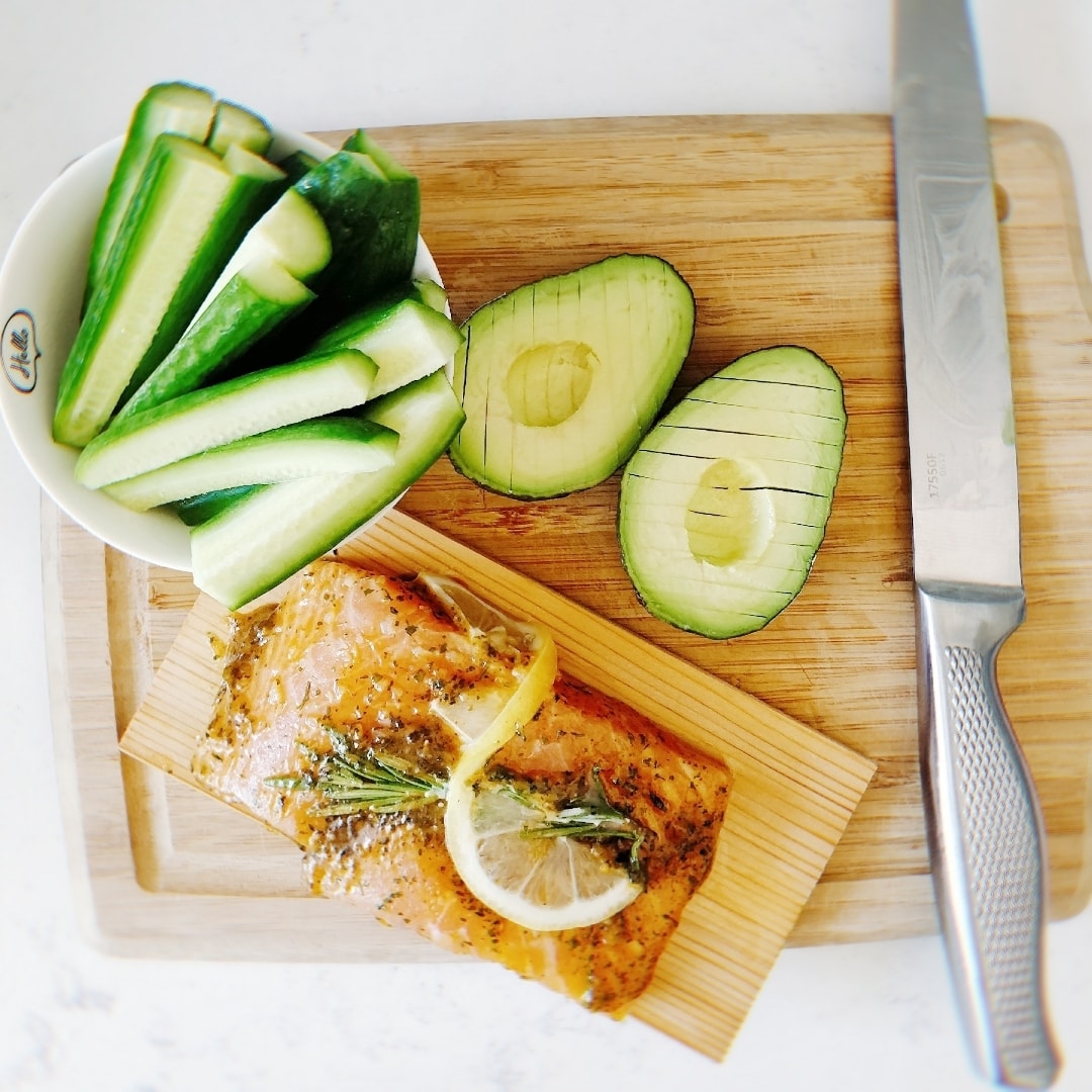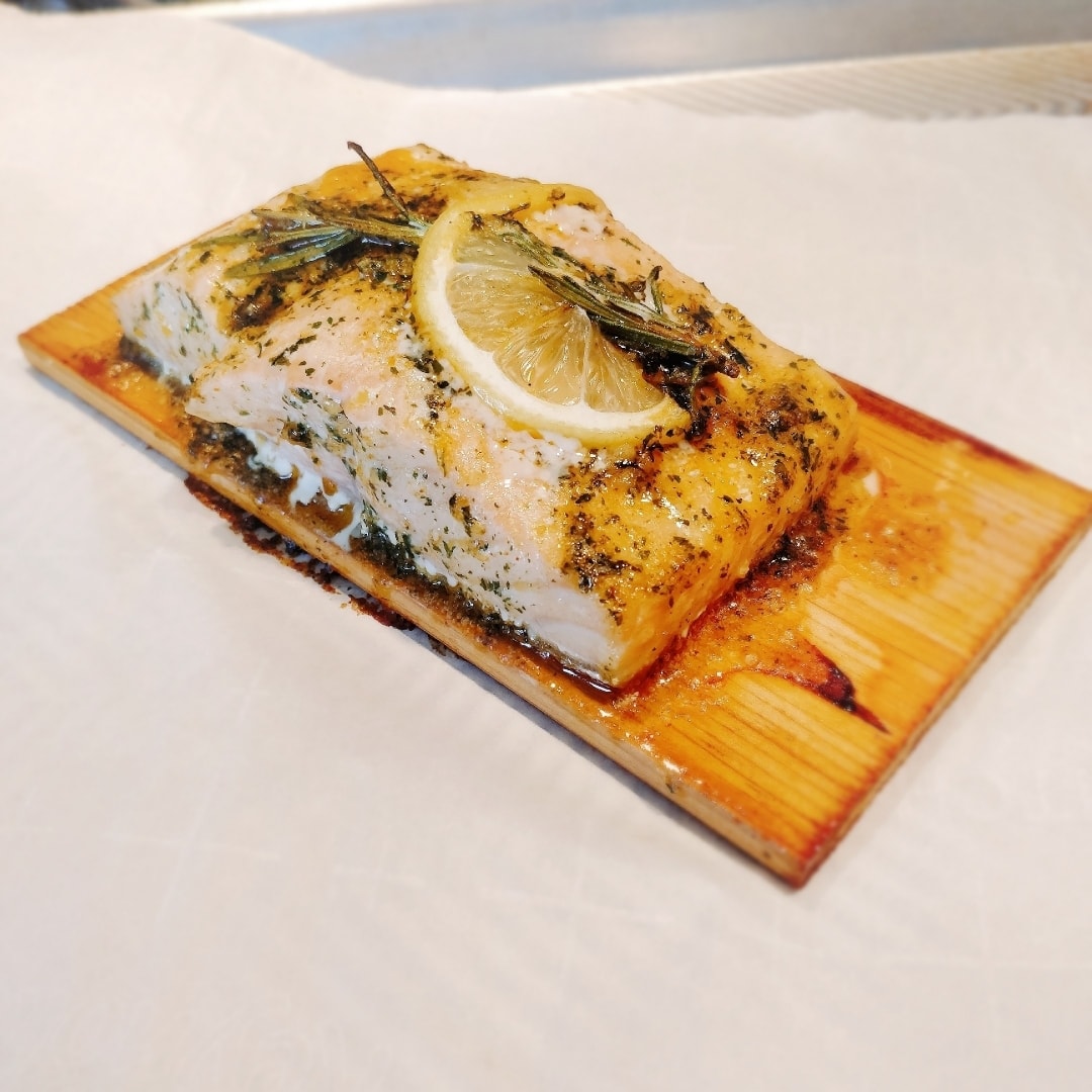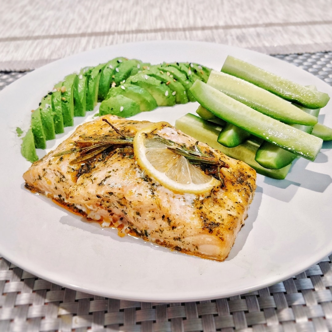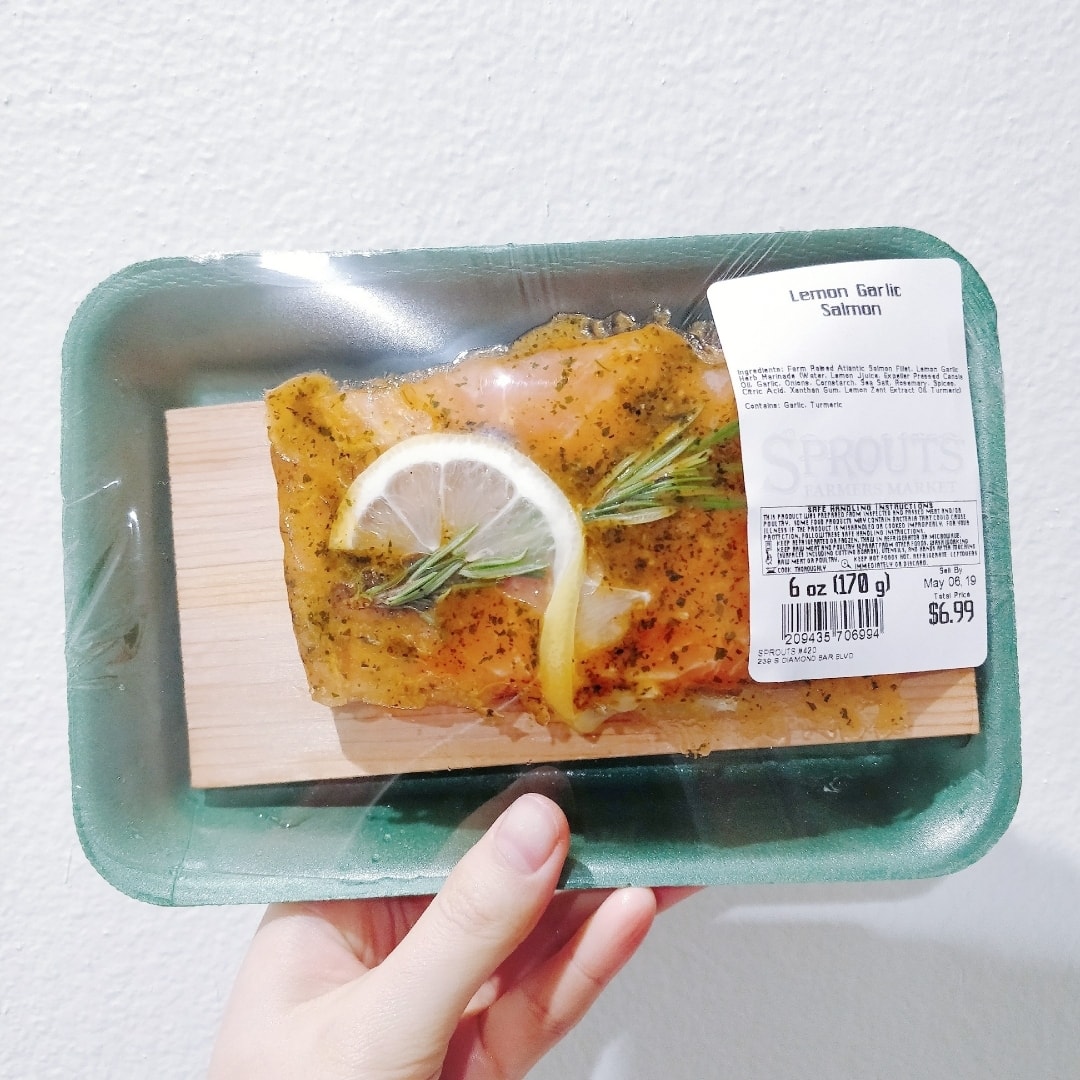 # 炸鸡厨房 # 最近一直喜歡Sprout$5.99一塊的三文魚,那天本來是想買的。逛過去看到它樓上住著這個調過味的Lemon Garlic Salmon賣相這麼美上面還有迷迭香和檸檬,於是外貿協會的我就忍不住買了貴$1的它 😆,打包的小哥連這下款木板一起包起來。 做法超方便,下面的木板是可以直接放到烤箱的,只需要放到烤箱大概360°F烤15分鐘左右就好了,我喜歡吃裡面粉紅嫩嫩的三文魚。 首先魚很新鮮就不用說啦,這個調味我覺得剛好,檸檬的酸味比較明顯(不喜歡酸的小夥伴可能沒辦法)。整體能吃出加了不少香辛料,口味偏鹹不會太淡。 那個木板應該洗過可以循環使用,感覺比起買沒有調味的,那$1值回來了🤩