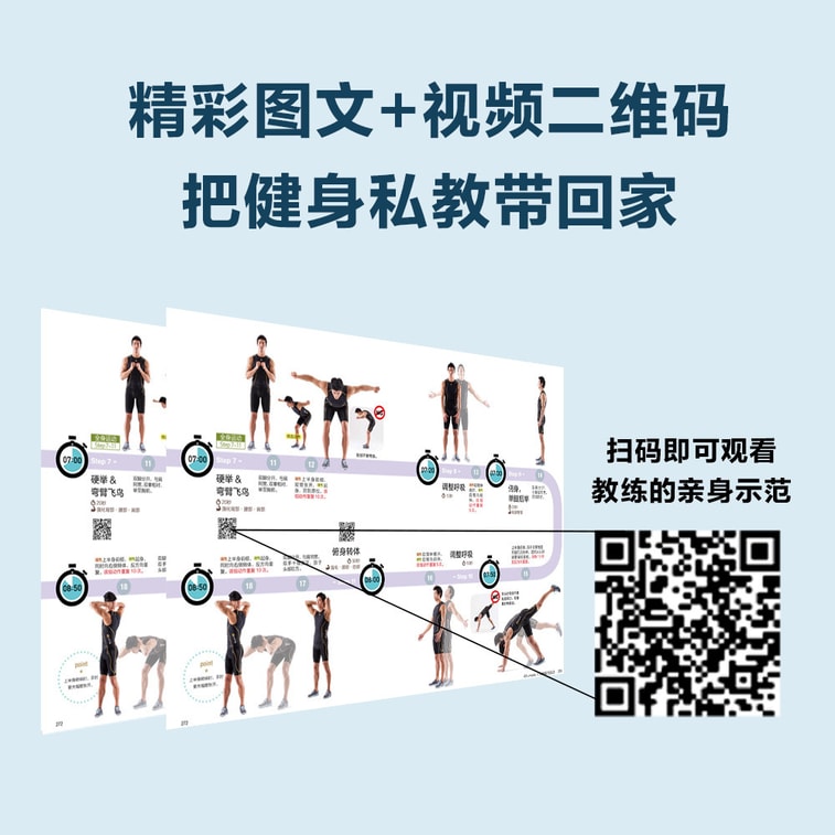 每一套动作都有详细的图文说明,重点动作还配有二维码,扫码即可观看教练的亲身示范。