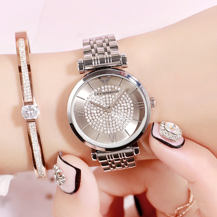 中国直邮 歌迪GEDI 爆款满天星品牌女士镶钻女表时尚潮流防水手表 银壳灰盘