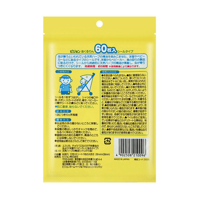 日本PIGEON贝亲 新生儿婴儿宝宝儿童 天然精油桉树油防蚊驱虫贴 驱蚊贴 防蚊贴 60枚入【夏季户外】