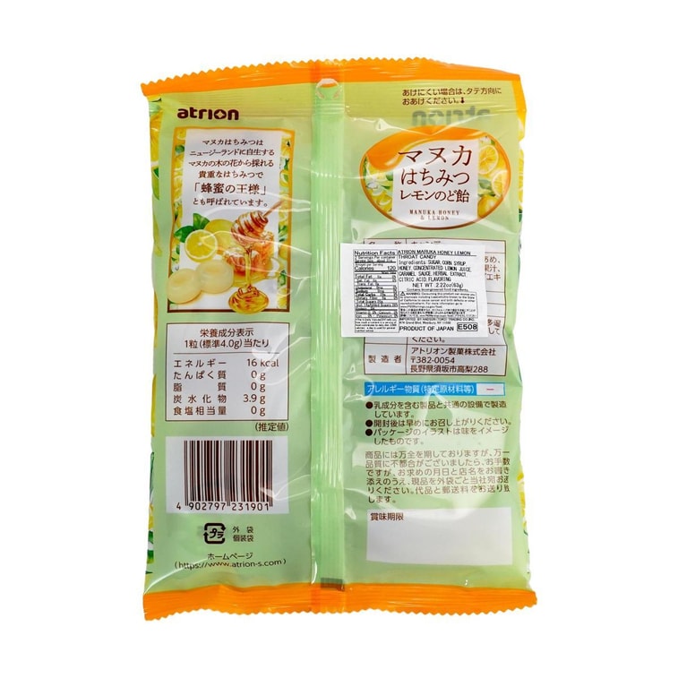 日本ATRION 麦卢卡蜂蜜柠檬喉糖 63g【含12种草本提取物】