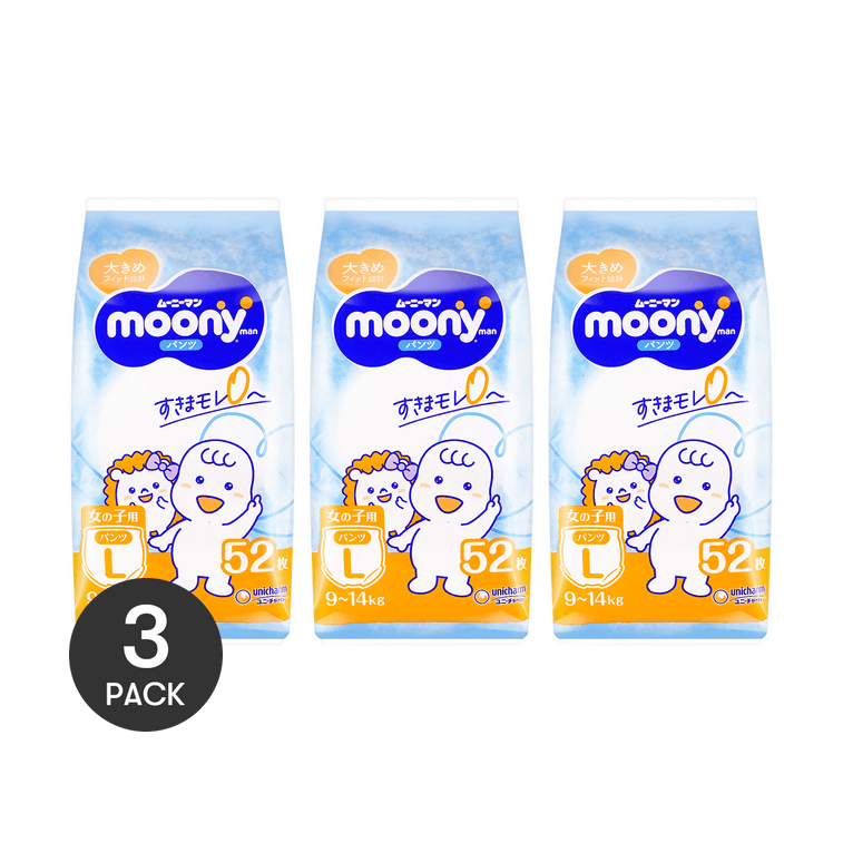 【囤货3包】日本MOONY尤妮佳 女童拉拉裤学步裤拉拉裤 9~14kg 52片*3 L码