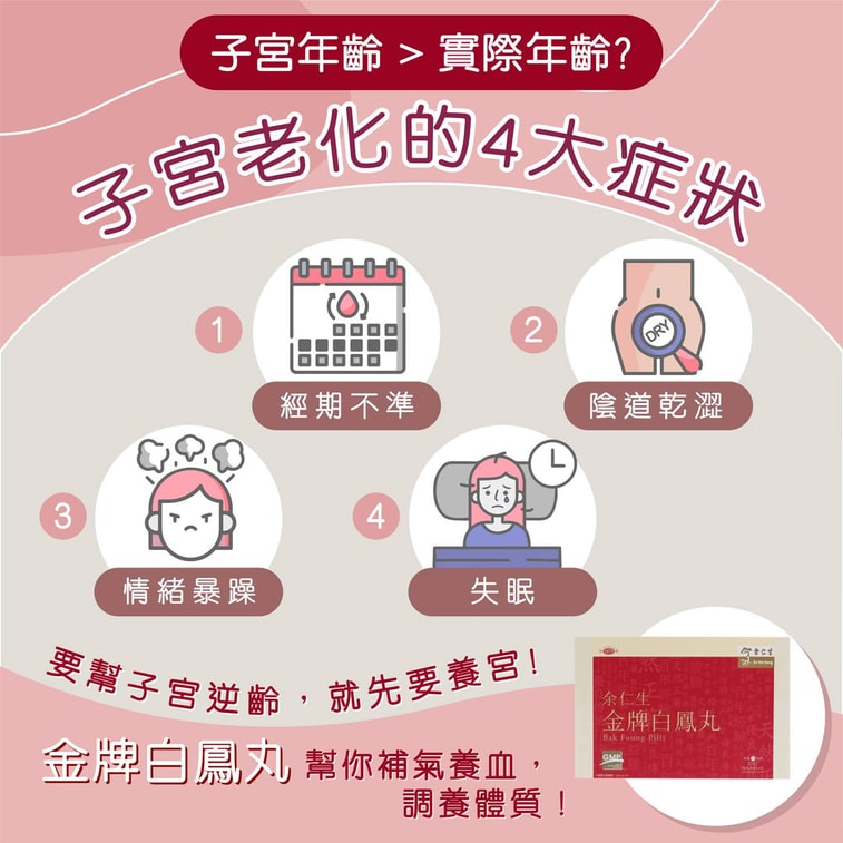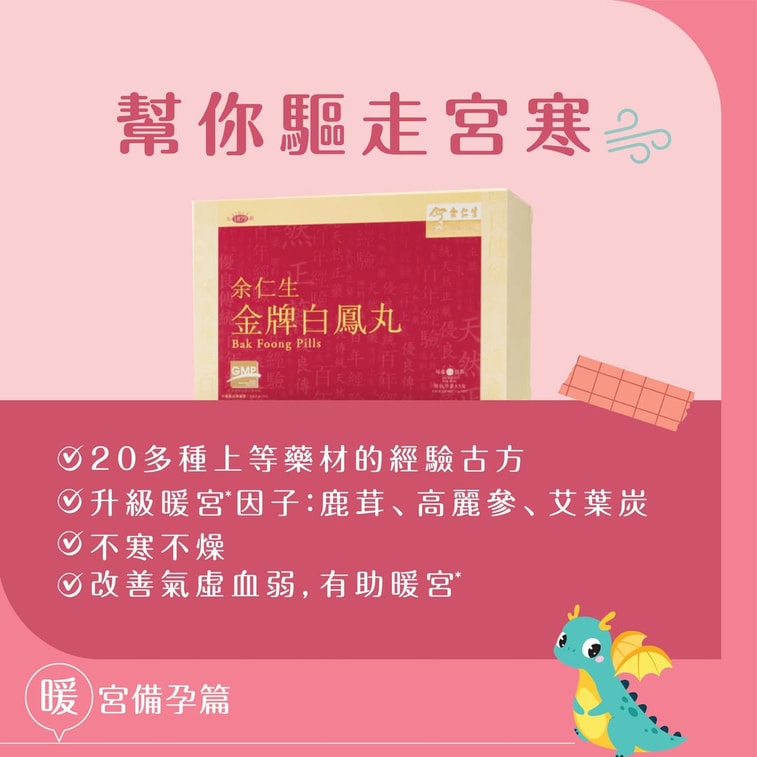 余仁生金牌白凤丸(小丸装)是以二十多种上等药材及经验古方配制,定期服用,能舒缓女性月事不适、补气活血、滋阴养颜、强身健体。且不寒不燥,四季适宜,是妇女保健养颜的最佳良方。