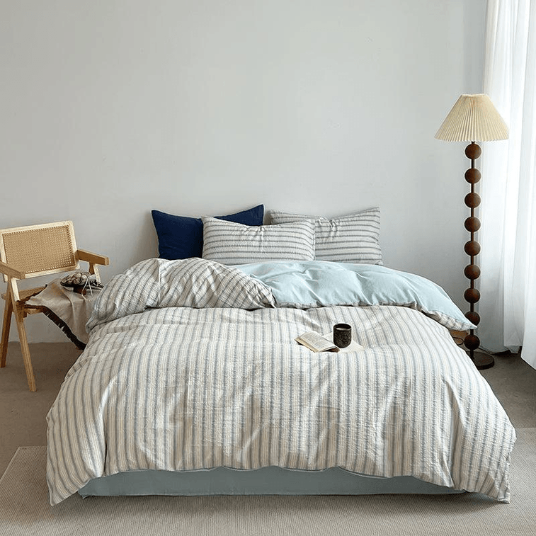 【中国直邮】 Lullabuy 织序水洗棉条纹床上四件套 蓝色-Queen | 亚米