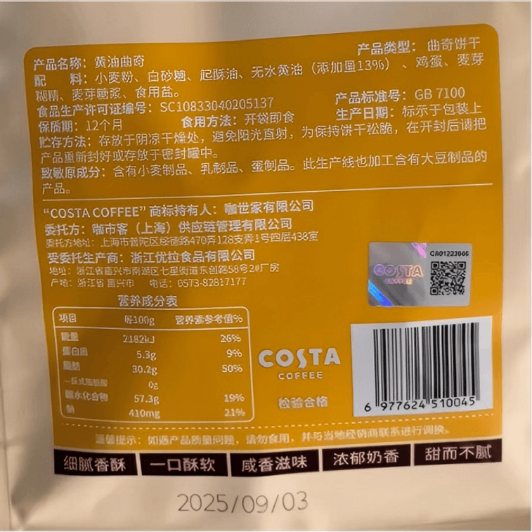 【中国直邮】 COSTA 黄油曲奇饼干 香甜酥脆 休闲办公室零食 下午茶 85g×1袋