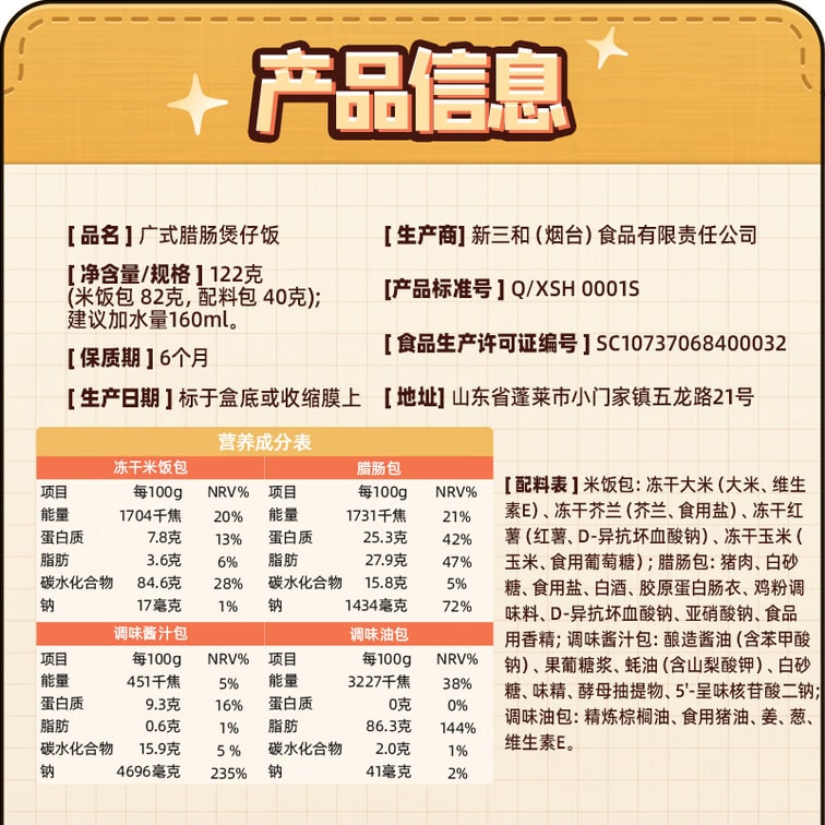 | 口味 | 广式腊肠煲仔饭122g |