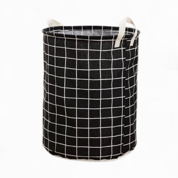 小麦色工厂 黑格子圆形大号收纳筐脏衣篮棉麻布艺折叠收纳 1个 43*37.5CM