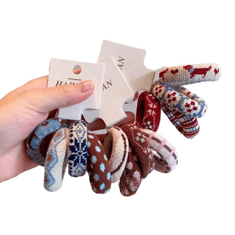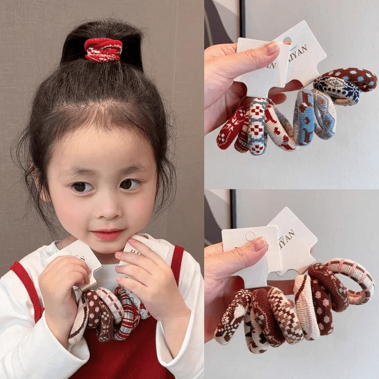 【中国直邮】 西坞 儿童秋冬复古费尔岛风毛巾圈高弹扎马尾皮筋女童加粗混装5cm*12个