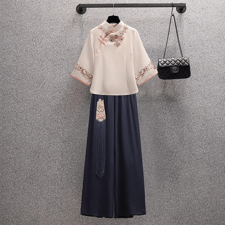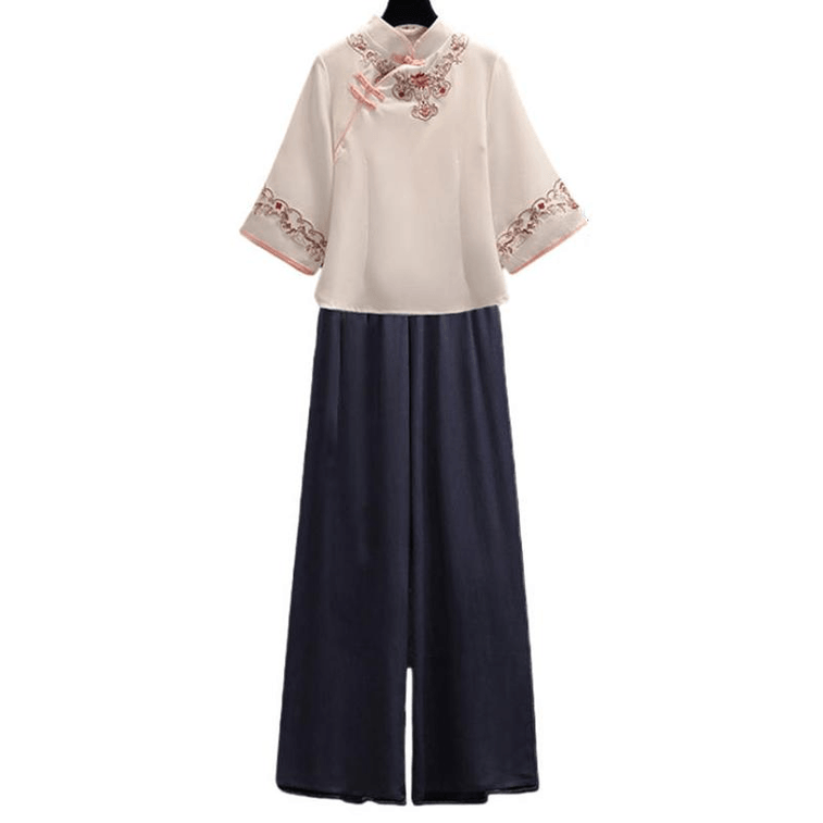 【中国直邮】 ASIS 风刺绣盘扣女旗袍汉服套装-粉色 M