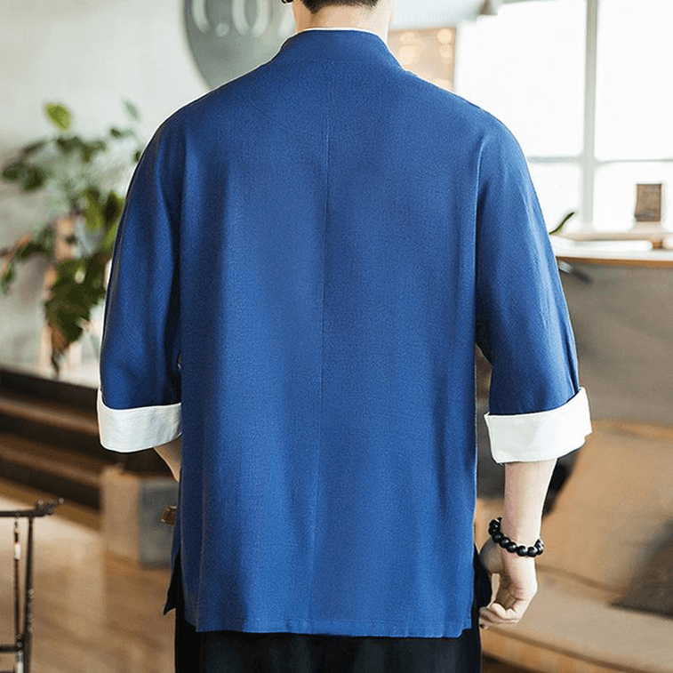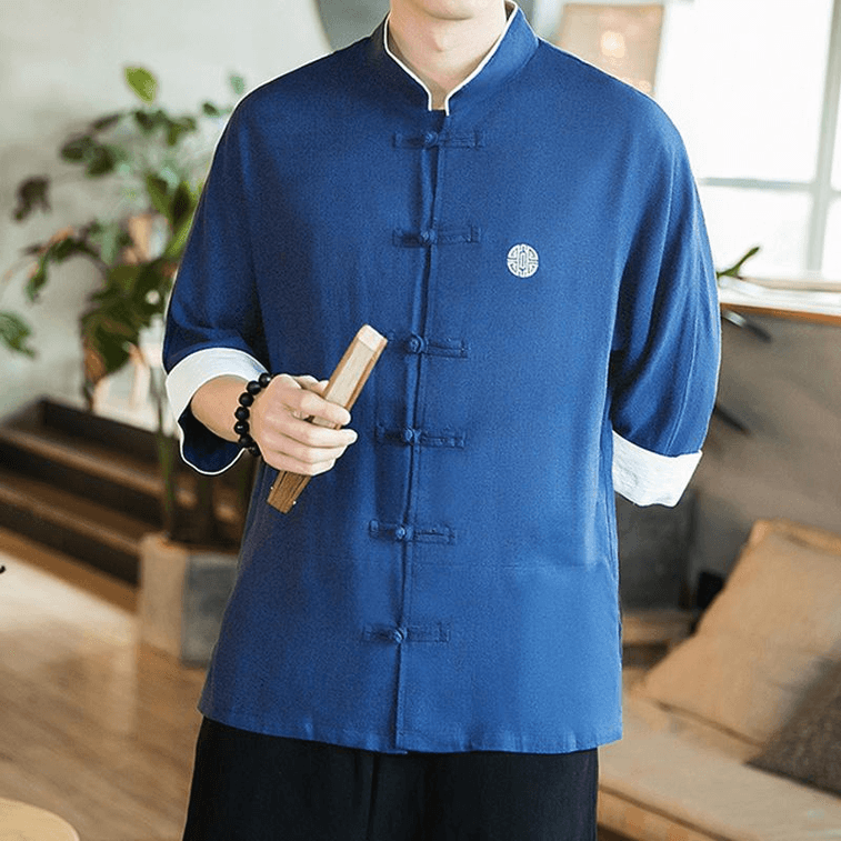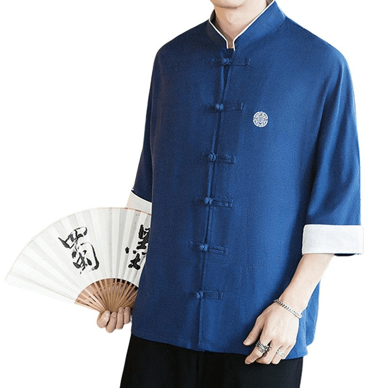 ASIS中国风棉麻刺绣七分袖盘扣唐装汉服-藏青色 M